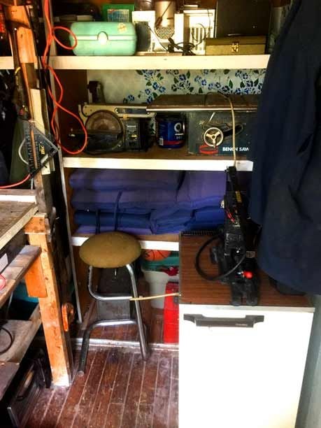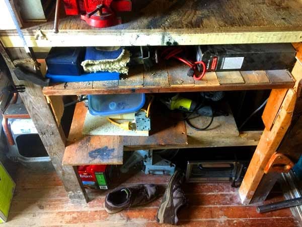 In the picture above you can see the place where I work on anything that's noisy, smelly, or needs to bring some power tools to bear. There's not alot of room but it's got all everything you really need.