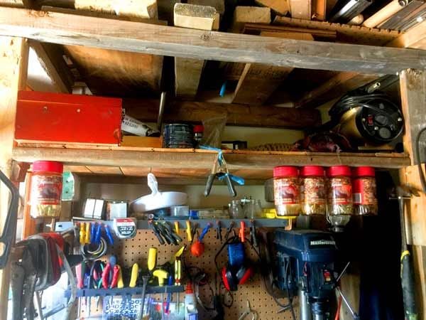 All the screws and nails I use on almost every project are in the coffee jars, just screw the lid to the bottom of the shelf and twist it in, I'd have more of these but I actuallyl stand there in the gap between jars.
